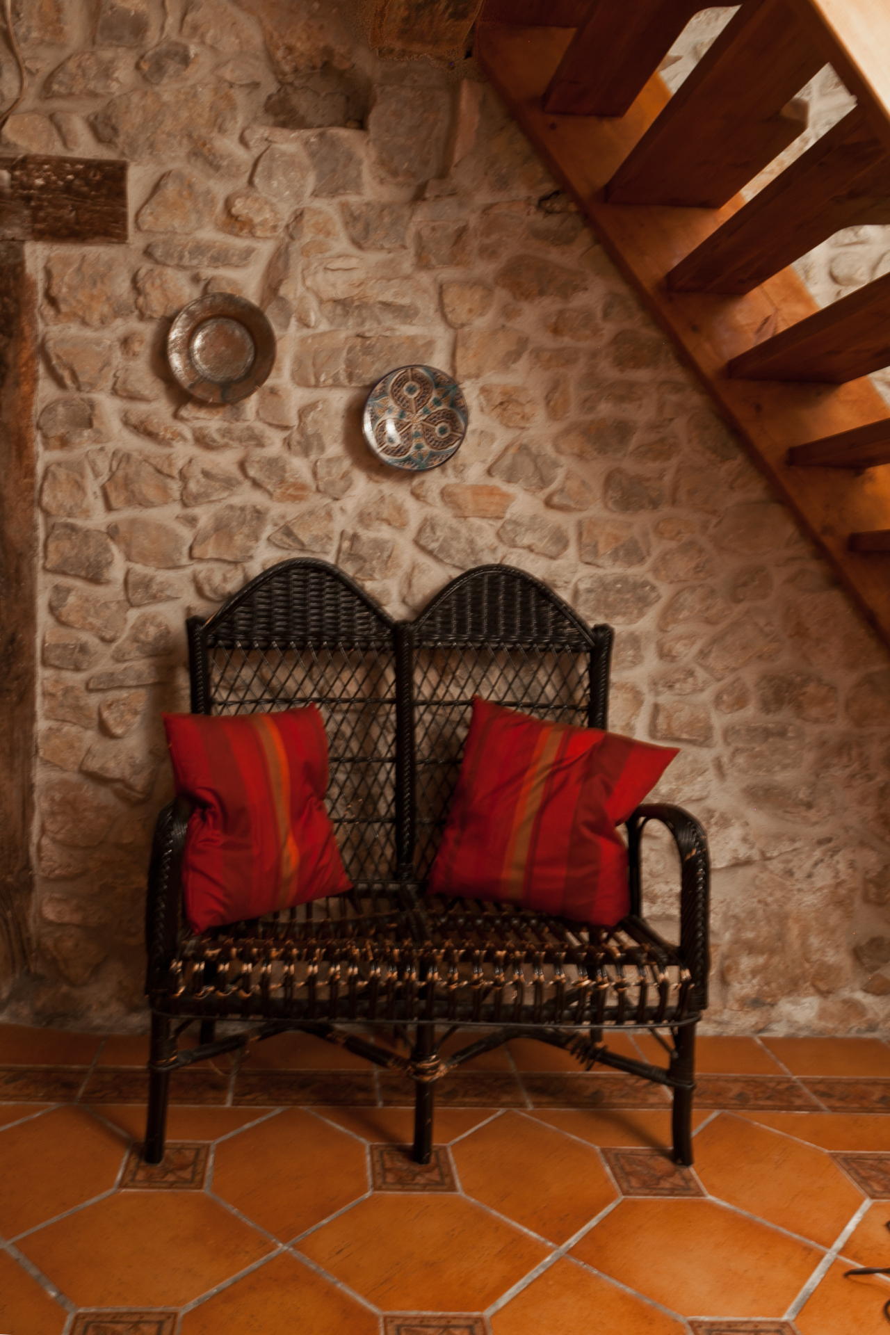 - On the ground floor one double bed room, one bedroom with a queen size bed, as well as a fully equipped bathroom (with shower). The full equipped kitchen is attached to a terrace, a big Living/Dining room with chimney. The living room leads to a closed terrace and the garden.